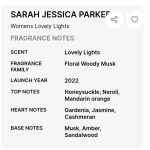 عطر زنانه لاولی لایتس عطر زنانهی Lovely Lights از برند سارا جسیکا پارکر، رایحهای گلی-چوبی-مشکی دارد. این عطر جدید است. Lovely Lights در سال 2022 به بازار عرضه شد.